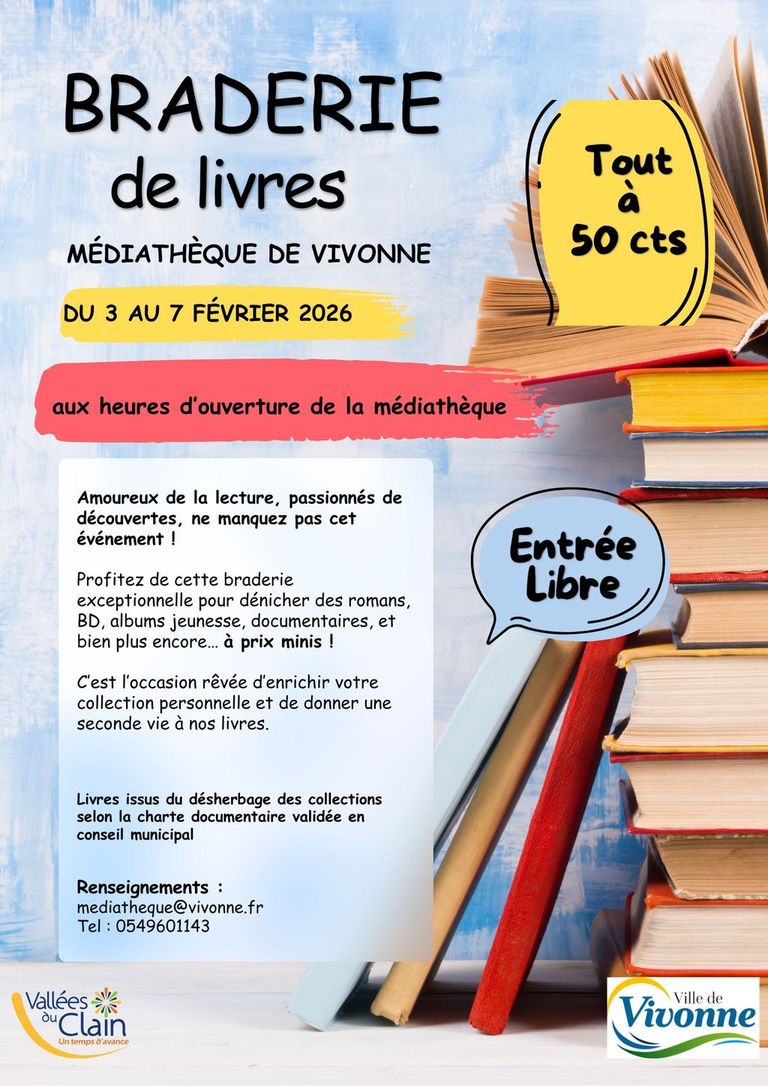 Du MARDI 3 au SAMEDI 7 : Braderie de livres – VIVONNE – Médiathèque – 15h