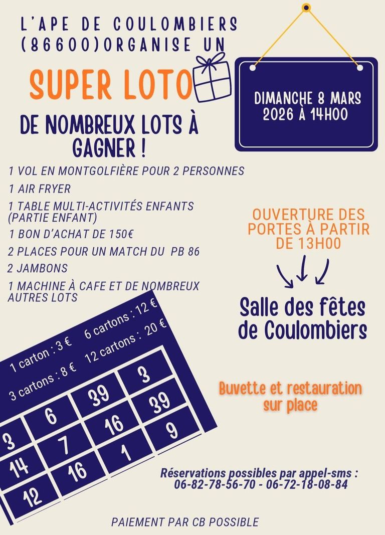 DIMANCHE 8 : SUPER LOTO DE L’APE DE COULOMBIERS – SALLE SOCIO-CULTURELLE – COULOMBIERS – 14H